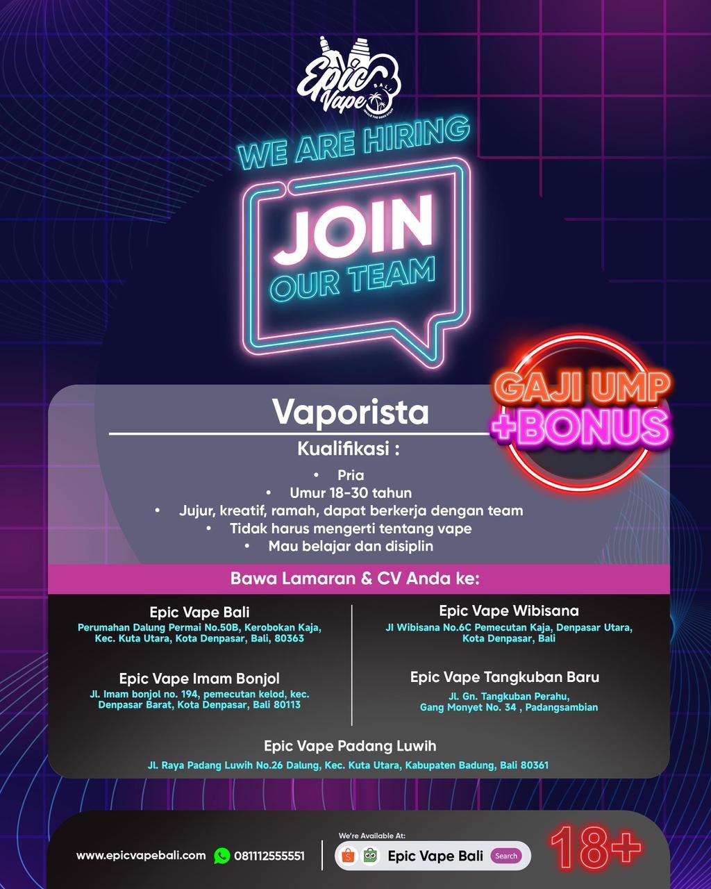 Epic Vape Bali, salah satu jaringan toko vape yang berkembang pesat di Pulau Bali, resmi mengumumkan pembukaan lowongan kerja untuk posisi Vaporista. Rekrutmen ini dibuka untuk mengisi kebutuhan tenaga operasional di beberapa cabang Epic Vape yang tersebar di Kuta Utara, Denpasar, hingga Padangsambian.