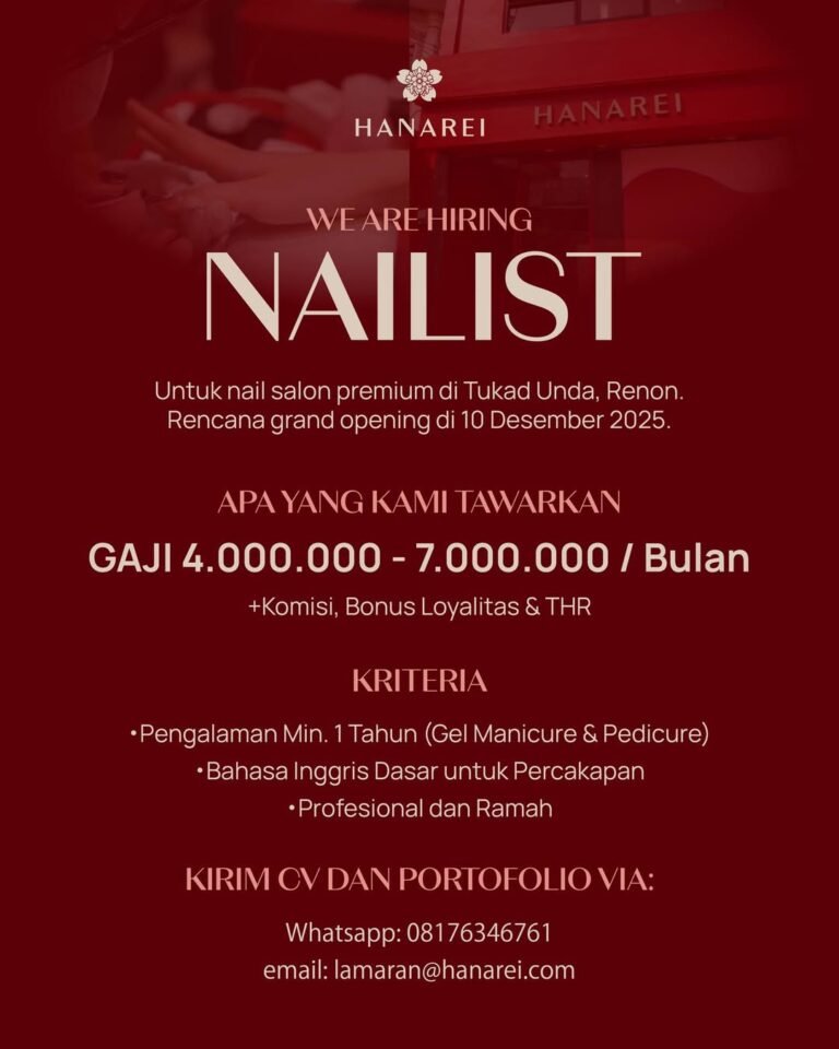 Denpasar – Hanarei, brand kecantikan yang tengah memperluas layanan, resmi membuka lowongan kerja untuk posisi Nailist. Rekrutmen ini dilakukan sebagai bagian dari persiapan grand opening nail salon premium mereka yang berlokasi di Jalan Tukad Unda, Renon, dan dijadwalkan dibuka pada 10 Desember 2025.
