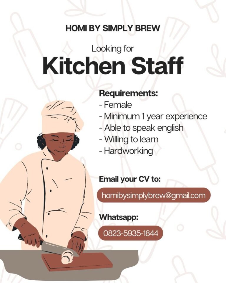 HOMI BY SIMPLY BREW membuka peluang bagi para wanita yang bersemangat di dapur untuk bergabung sebagai Kitchen Staff. Perusahaan mencari individu yang pekerja keras, memiliki pengalaman, dan siap untuk mengembangkan keterampilan mereka dalam lingkungan kerja yang baru.