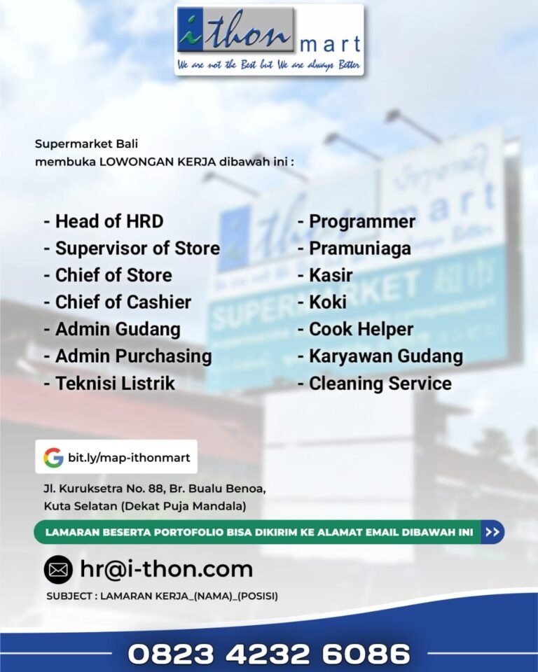 KUTA SELATAN, BALI – iThon Mart, sebuah supermarket yang berlokasi di Bali, mengumumkan pembukaan lowongan kerja besar-besaran untuk mengisi 12 posisi sekaligus, mulai dari level manajemen hingga staf operasional. Kesempatan ini terbuka bagi para profesional dan individu yang bersemangat untuk berkarir di sektor ritel dan supermarket.