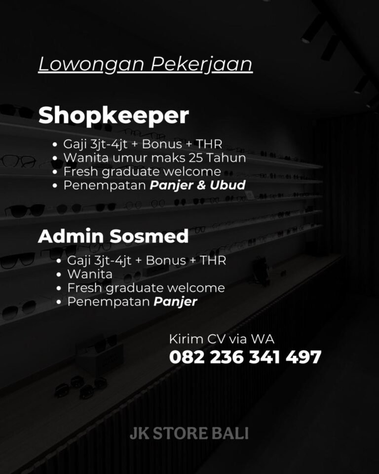 Untuk posisi Shopkeeper, JK Store Bali mencari kandidat wanita dengan usia maksimal 25 tahun. Posisi ini menawarkan gaji berkisar 3 juta hingga 4 juta rupiah, ditambah bonus dan THR. Perusahaan juga menyatakan bahwa fresh graduate dipersilakan melamar, sehingga peluang ini cocok bagi individu yang baru memasuki dunia kerja.