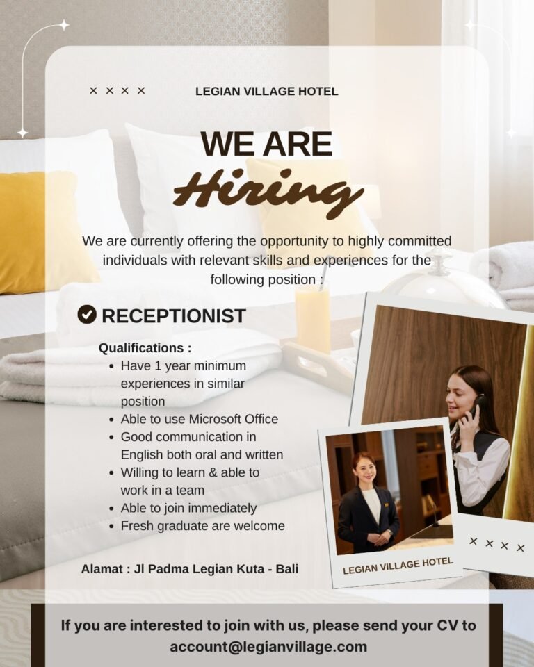 Legian Village Hotel membuka kesempatan karier yang menarik bagi individu yang berkomitmen tinggi dan memiliki keterampilan serta pengalaman yang relevan untuk bergabung sebagai Resepsionis. Hotel yang berlokasi strategis di Jl. Padma Legian Kuta – Bali ini mencari talenta untuk memperkuat tim front office mereka.