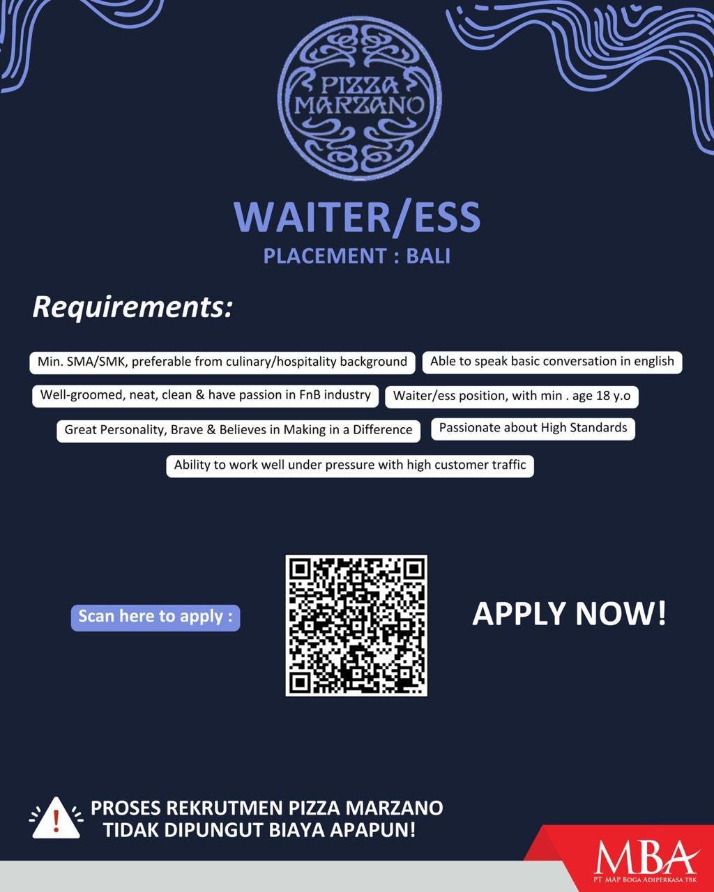 Bali – Jaringan restoran internasional Pizza Marzano kembali membuka peluang kerja bagi tenaga profesional di industri FnB. Untuk memperkuat operasional di wilayah Bali, perusahaan mengumumkan dua lowongan penting, yakni Waiter/Waitress dan Pizzaiolo.