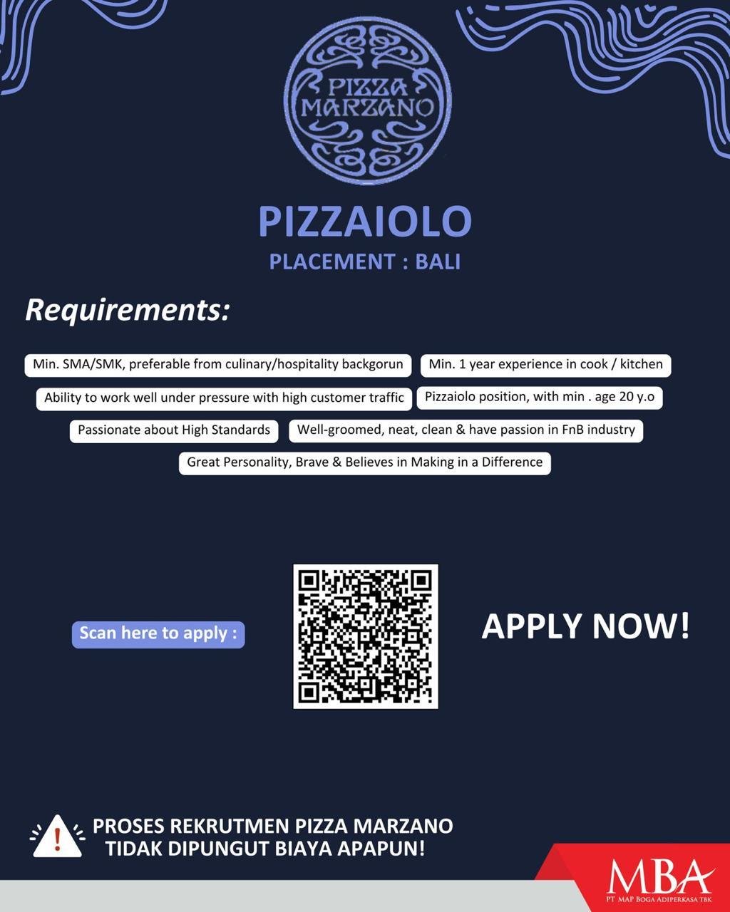 Untuk posisi dapur, Pizza Marzano membuka lowongan Pizzaiolo dengan minimal satu tahun pengalaman memasak atau bekerja di kitchen. Kandidat wajib memiliki pendidikan SMA/SMK (lebih disukai jurusan kuliner/hospitality) dan usia minimal 20 tahun.