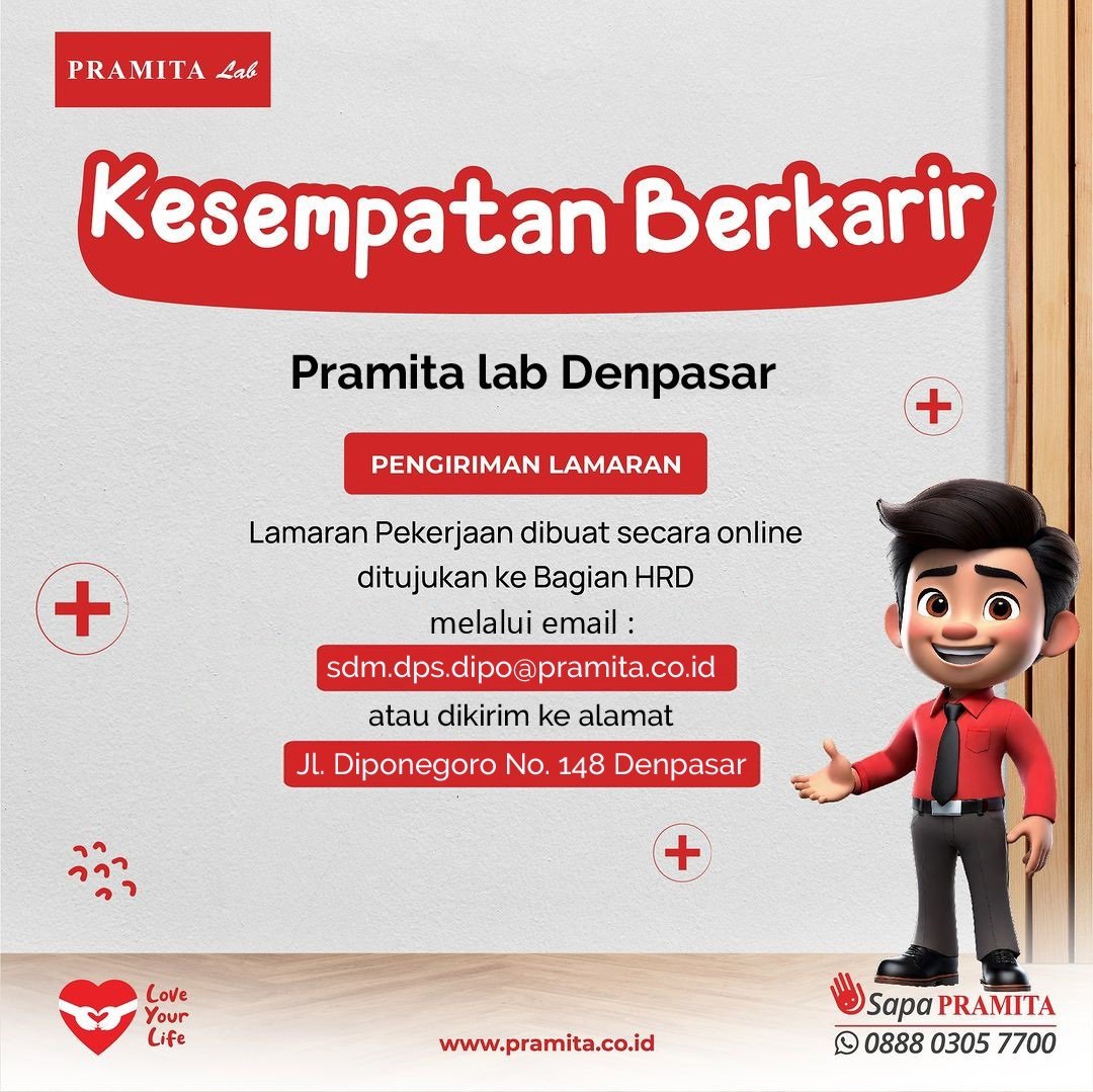 DENPASAR, BALI – Laboratorium Medis dan Klinik Pramita Cabang Denpasar membuka kesempatan berkarir bagi para profesional dan lulusan baru untuk bergabung dalam tim mereka. Rekrutmen ini mencakup posisi spesialis di bidang medis, seperti radiologi dan keperawatan, hingga posisi umum.