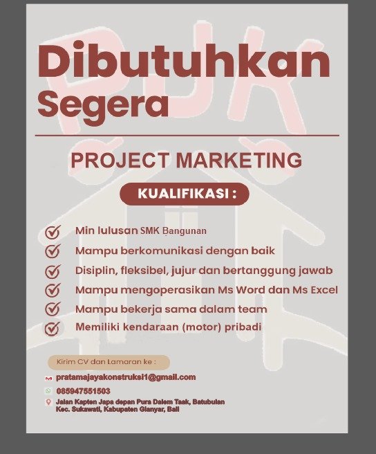 Pratama Jaya Konstruksi yang berlokasi di Batubulan, Bali, saat ini membuka kesempatan kerja untuk posisi penting sebagai Project Marketing. Perekrutan ini bersifat mendesak (Dibutuhkan Segera) untuk individu yang siap bergabung dengan tim konstruksi.