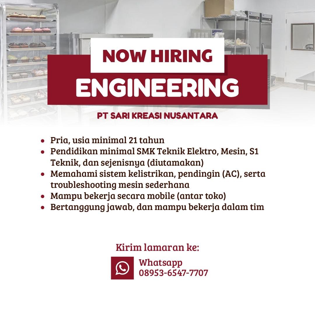 Dengan dibukanya posisi ini, PT Sari Kreasi Nusantara berharap dapat menemukan tenaga engineering yang kompeten dan berdedikasi untuk mendukung kelancaran operasional perusahaan.