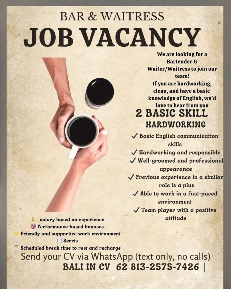 Sebuah restoran di Kerobokan, Bali, membuka lowongan pekerjaan untuk posisi Bartender dan Waiter/Waitress. Restoran ini mencari kandidat yang rajin, bersih, dan memiliki pengetahuan dasar bahasa Inggris.