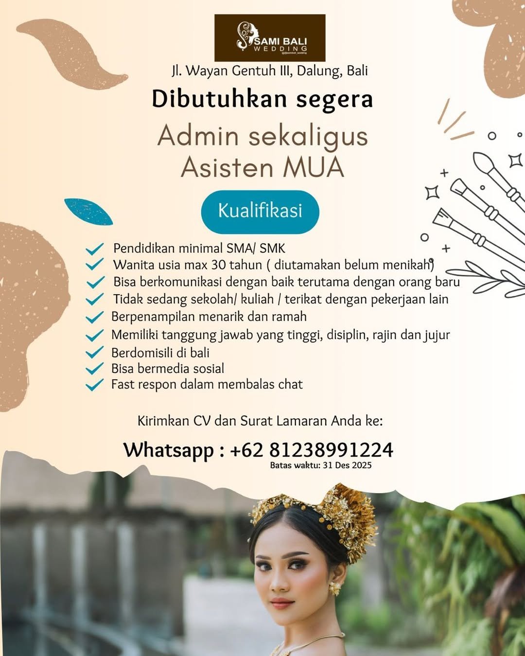 Dalung, Bali – Sami Bali Wedding, penyedia layanan pernikahan tradisional dan modern, resmi membuka kesempatan bagi kandidat muda untuk bergabung sebagai Admin sekaligus Asisten MUA. Posisi ini ditujukan untuk mendukung kebutuhan operasional serta proses makeup dalam berbagai acara pelanggan.