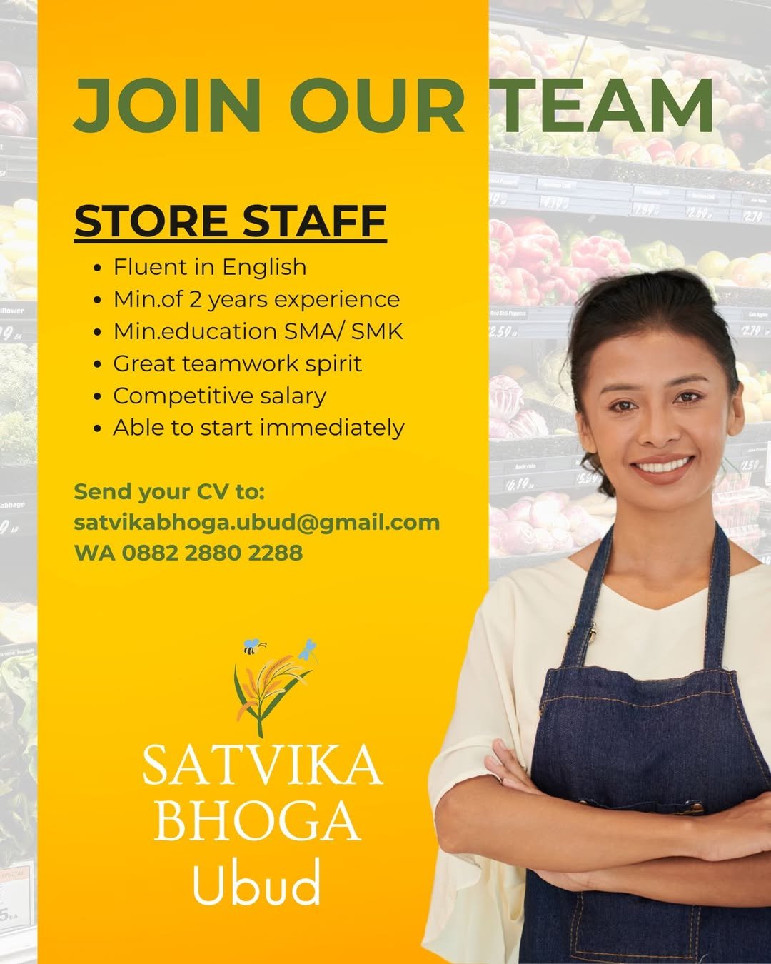 Satvika Bhoga Ubud membuka kesempatan karier yang menarik bagi individu yang siap untuk segera bergabung sebagai Store Staff. Perusahaan ini mencari kandidat yang memiliki kemampuan bahasa Inggris yang fasih dan pengalaman kerja minimal 2 tahun.