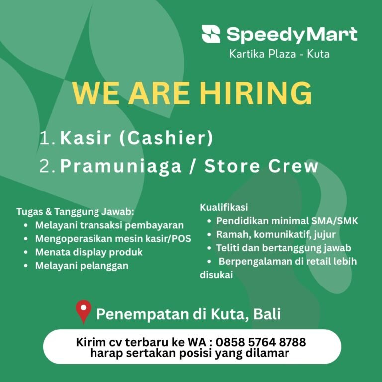 KUTA, BALI – Speedy Mart Kartika Plaza, yang berlokasi di area Kuta, Bali, membuka rekrutmen untuk individu yang siap berkarir di sektor ritel. Tersedia dua posisi utama, yaitu Kasir (Cashier) dan Pramuniaga (Store Crew), yang terbuka bagi yang memiliki passion dalam pelayanan pelanggan dan ketelitian.