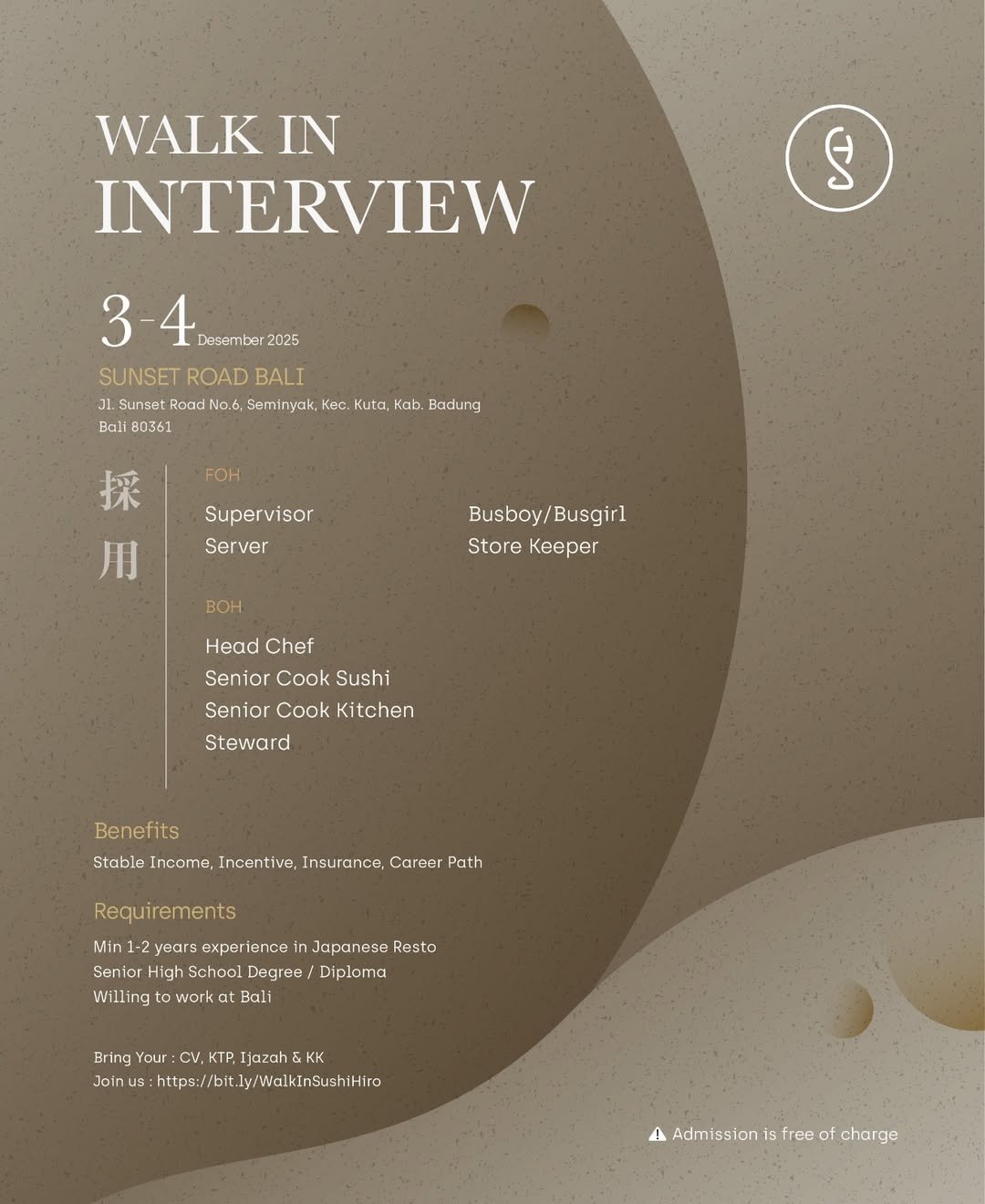 Sushi Hiro, salah satu restoran Jepang terkemuka, mengundang talenta-talenta terbaik di Bali untuk mengikuti Walk-In Interview yang akan diadakan pada 3-4 Desember 2025. Ini adalah kesempatan emas untuk mendapatkan karier yang stabil di industri hospitality.