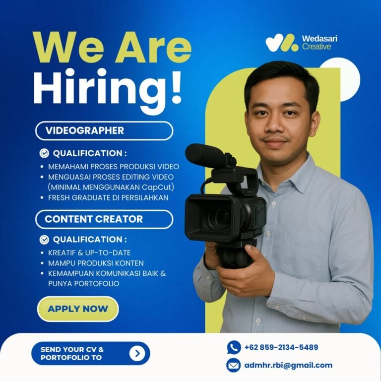 Wedasari Creative membuka kesempatan emas bagi individu yang kreatif dan memiliki passion di bidang produksi media untuk mengisi dua posisi: Videographer dan Content Creator. Perusahaan ini bahkan menyambut fresh graduate yang memiliki potensi untuk posisi Videographer.