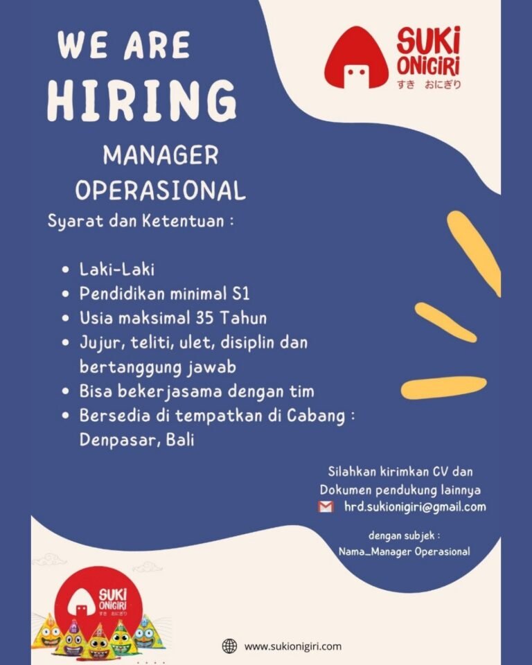 Suki Onigiri membuka kesempatan berkarier bagi Anda yang berpengalaman dan siap memimpin tim sebagai Manager Operasional di cabang Denpasar, Bali.