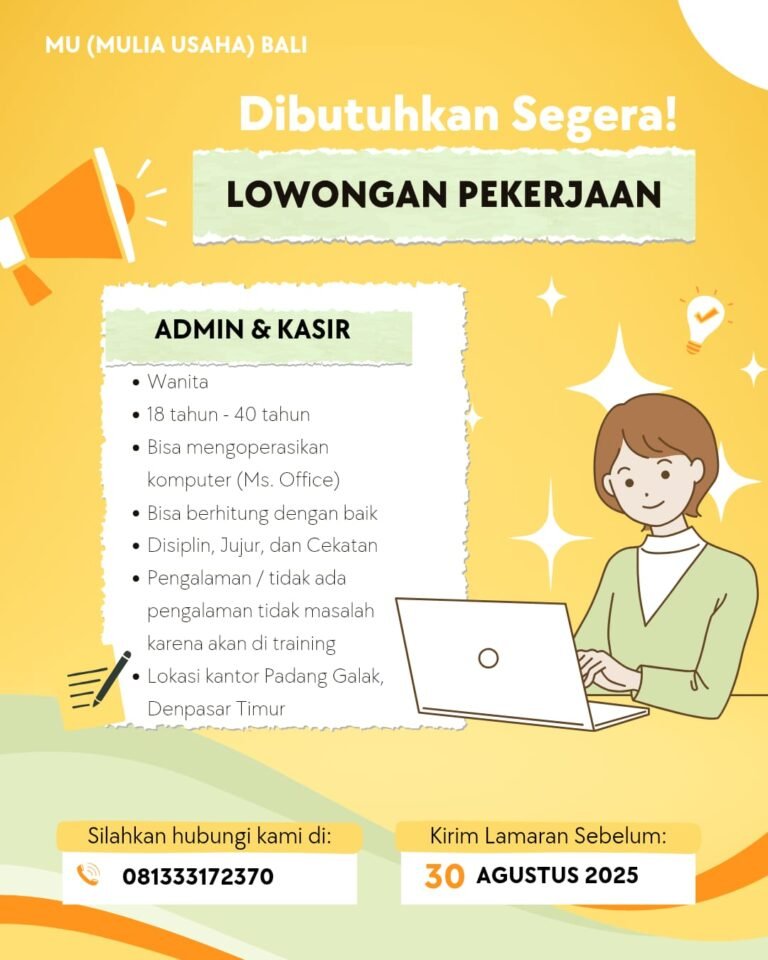 Mulia Usaha Bali is urgently looking for a new Admin & Kasir to join our team in Padang Galak, Denpasar! 🇮🇩