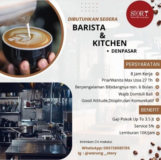 Story Kitchen & Bar di Denpasar sedang membuka kesempatan bagi Anda yang berpengalaman di bidang F&B untuk bergabung sebagai Barista dan Kitchen Staff.