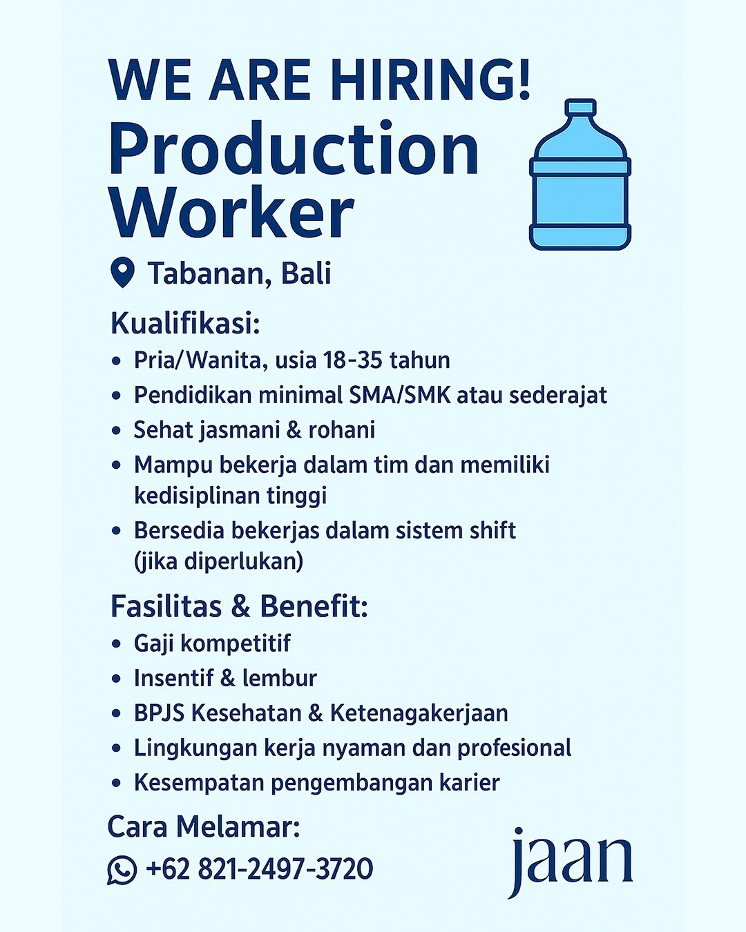 ✨ Jadilah bagian dari tim Jaan Water dan berkontribusilah dalam menghadirkan produk air berkualitas bagi masyarakat Bali.