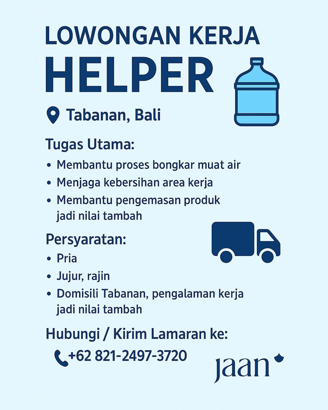 Jaan Water, perusahaan penyedia air minum dalam kemasan, saat ini membuka kesempatan kerja untuk beberapa posisi: Driver, Helper, dan Production Worker.