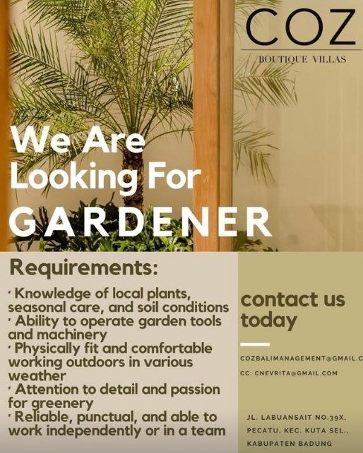 COZ Boutique Villas is looking for an experienced Gardener to join our team in Pecatu! 🇮🇩