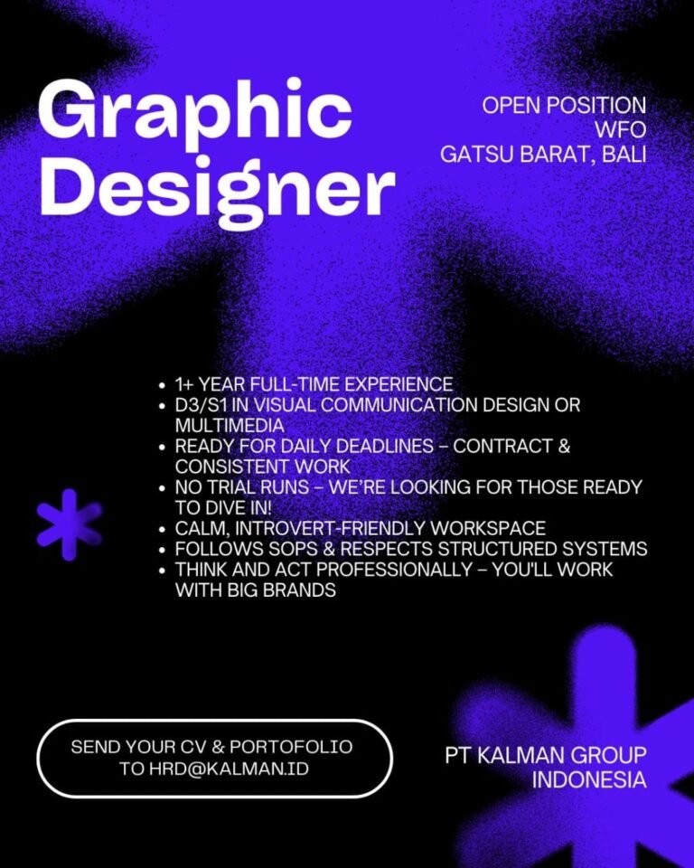 PT Kalman Group Indonesia is looking for an experienced Graphic Designer to join our team for a full-time office-based role in Gatsu Barat, Denpasar! 🇮🇩