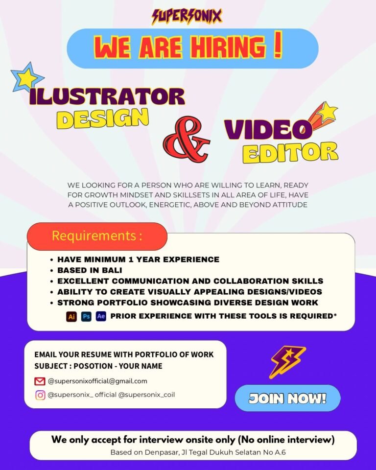 Supersonix membuka kesempatan bagi Anda yang bersemangat untuk berkembang sebagai Illustrator, Designer, dan Video Editor.