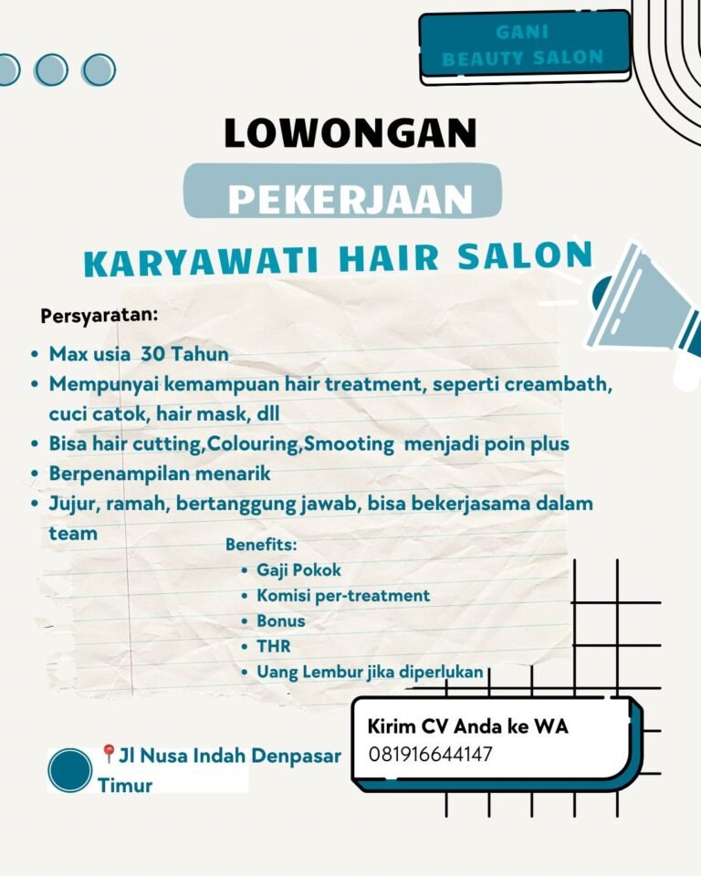 Gani Beauty Salon membuka kesempatan kerja untuk posisi Karyawati Hair Salon di wilayah Denpasar Timur.