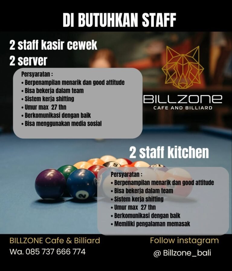 Billzone Cafe & Billiard is looking for new staff to join us in Denpasar! 🇮🇩