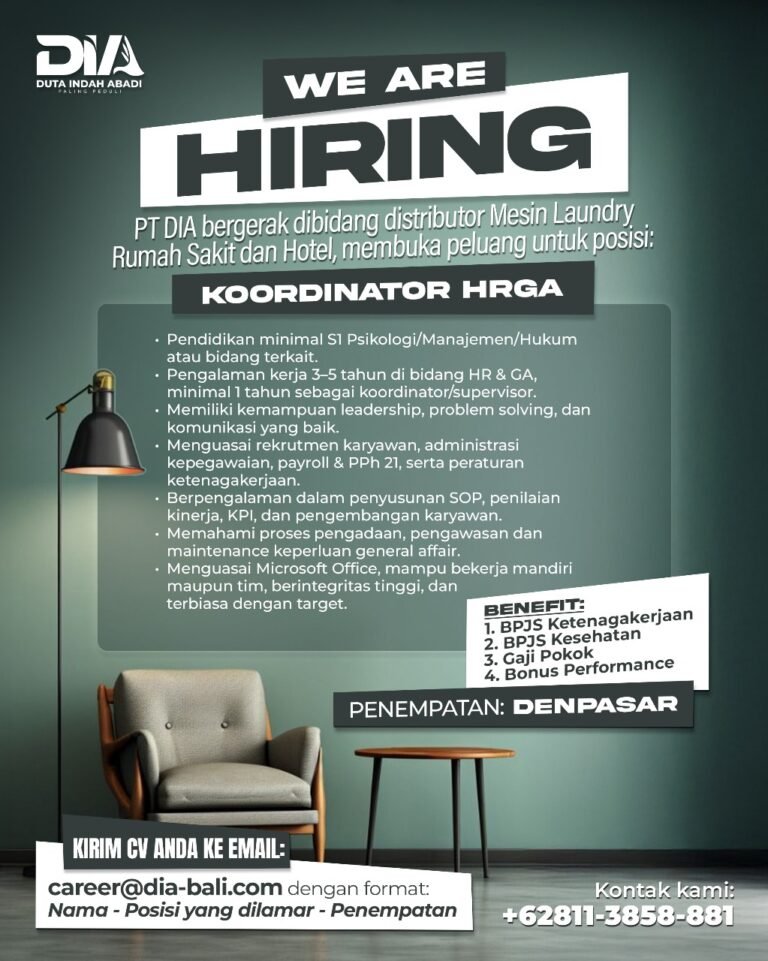 PT Duta Indah Abadi (DIA), perusahaan distributor mesin laundry untuk rumah sakit dan hotel, membuka kesempatan bagi profesional berpengalaman untuk bergabung sebagai Koordinator HRGA di Denpasar, Bali.