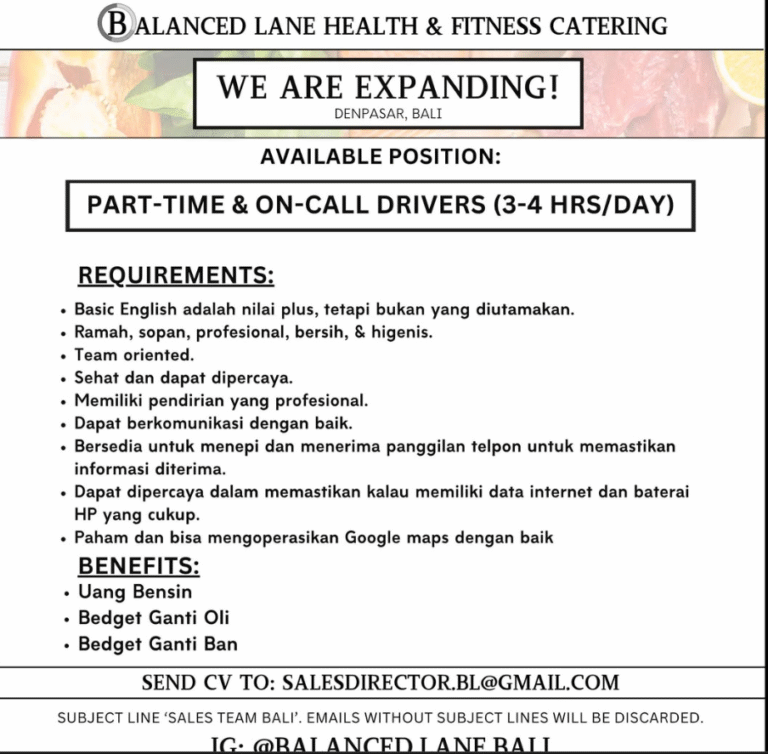 Balanced Lane Health & Fitness Catering di Denpasar sedang mencari individu yang berdedikasi dan dapat diandalkan untuk bergabung dengan tim kami.