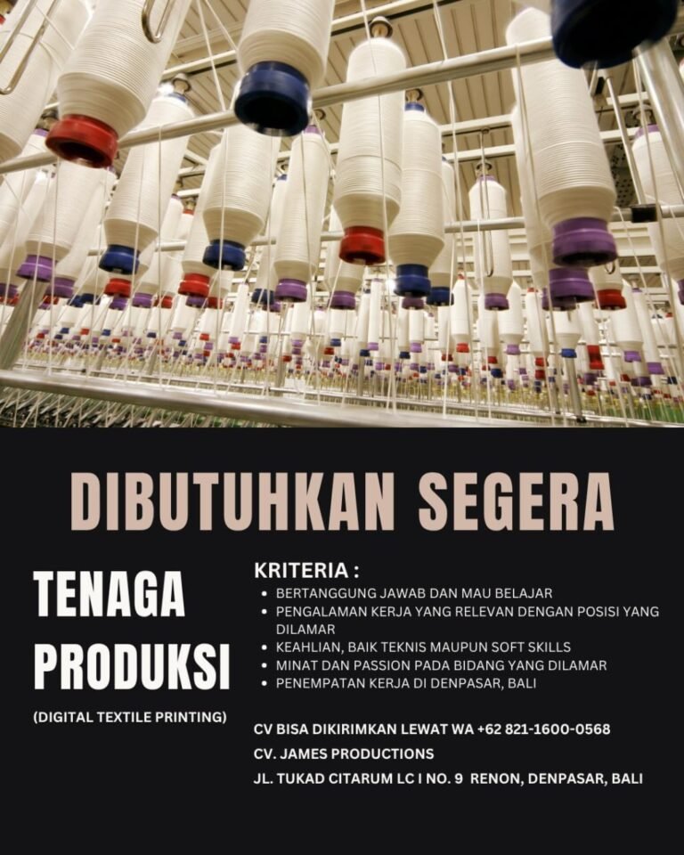 CV. James Productions is looking for a new Production Staff member for our Digital Textile Printing division in Denpasar, Bali! 🇮🇩