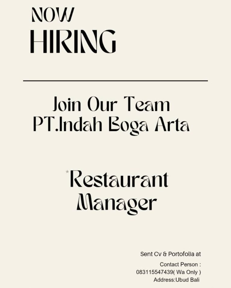 PT. Indah Boga Arta is looking for a professional Restaurant Manager to join our team in Ubud! 🇮🇩