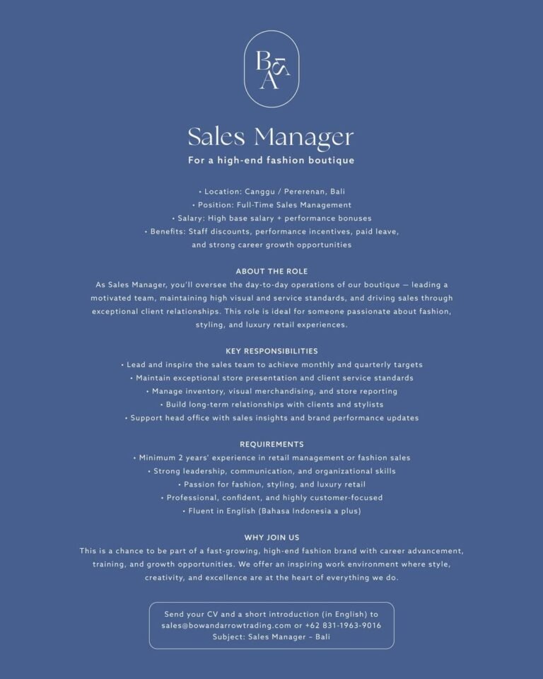 Bow & Arrow, butik fashion mewah di Bali, membuka kesempatan bagi profesional berpengalaman untuk bergabung sebagai Sales Manager (Full-Time).