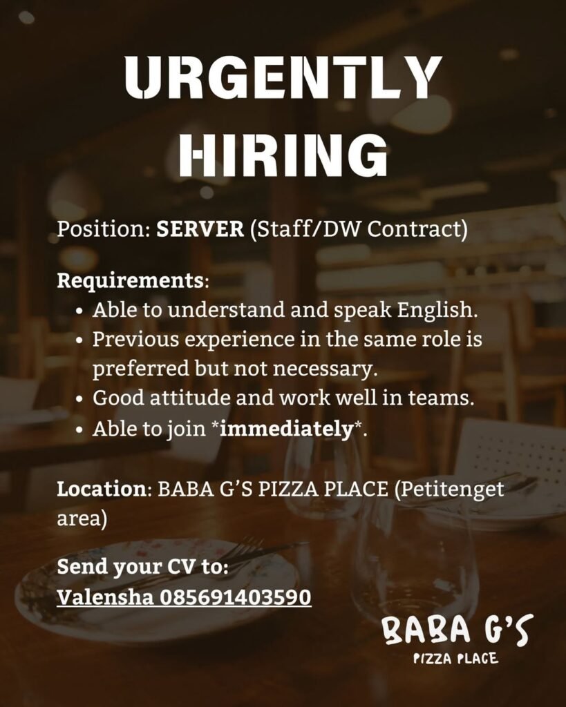 Baba G’s Pizza Place is urgently looking for a new Server (Staff/DW Contract) to join our team in the Petitenget area! 🇮🇩