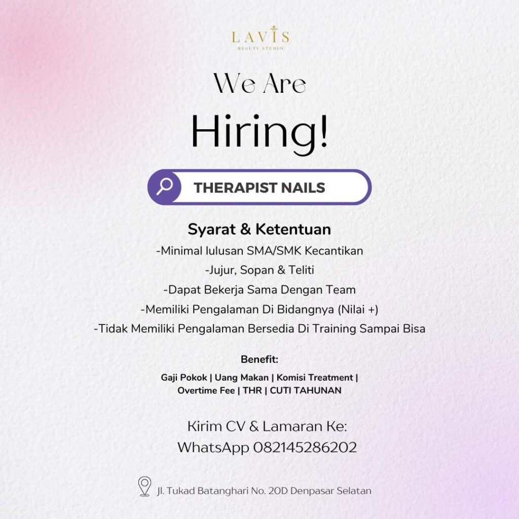 Dibutuhkan segera Therapist Nails untuk LAVIS Beauty Studio di Denpasar, Bali.