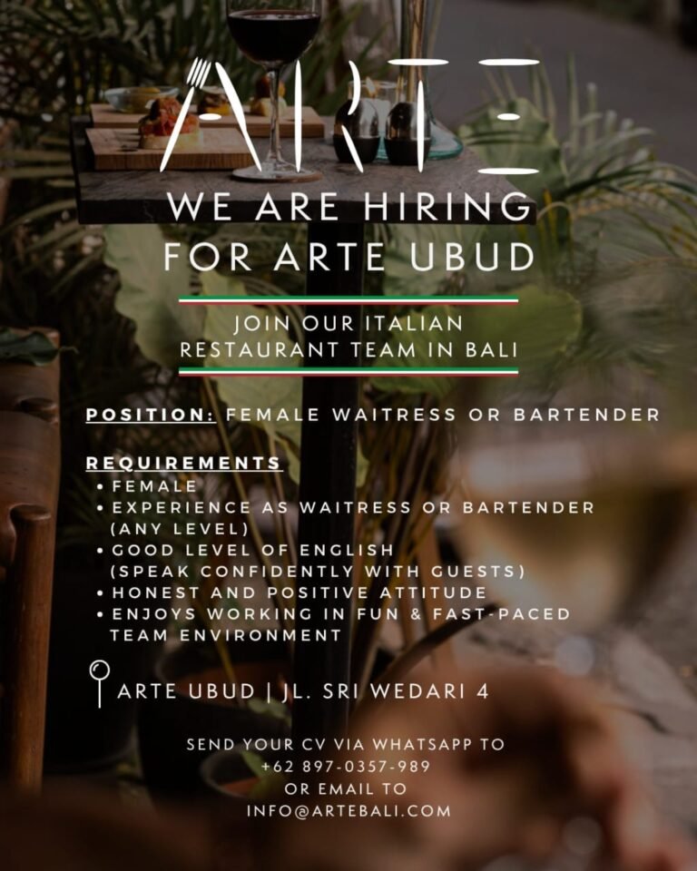 ARTE, an Italian restaurant in Ubud, is looking for a Waitress or Bartender to join our team! 🇮🇩