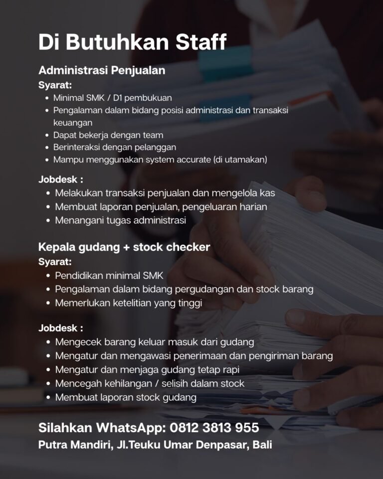 Lowongan Staff Administrasi Penjualan & Kepala Gudang di Putra Mandiri Denpasar