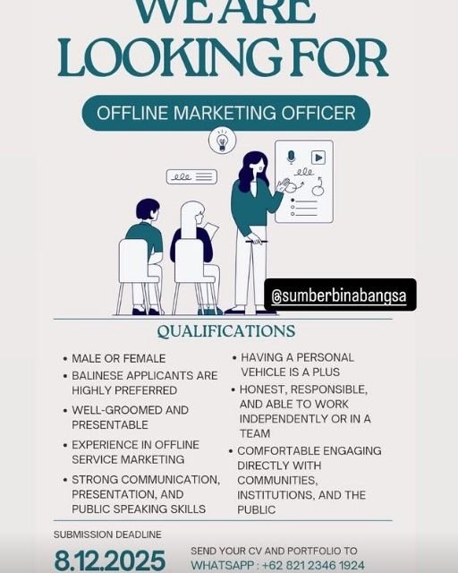 Denpasar – Sumber Bina Bangsa resmi mengumumkan pembukaan lowongan kerja untuk posisi Offline Marketing Officer, yang akan bertugas mengelola aktivitas pemasaran langsung dan menjalin hubungan dengan komunitas, institusi, serta masyarakat luas.