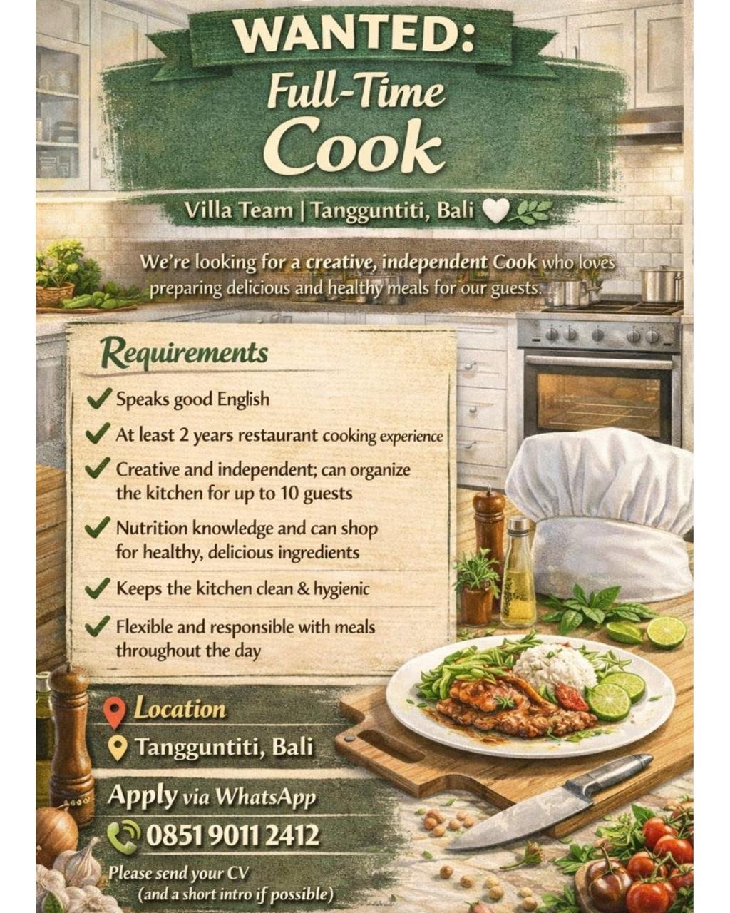 Adapun posisi yang tersedia mencakup Gardener (Full-Time), Housekeeping Team Member (Full-Time), Cook (Full-Time), dan Massage Therapist (Part-Time). Untuk posisi Cook dan Housekeeping, kandidat diwajibkan memiliki kemampuan bahasa Inggris yang baik serta pengalaman minimal dua tahun di industri serupa. Sementara itu, bagi pelamar posisi Massage Therapist, selain keahlian dalam pijat profesional dan gua sha, mereka juga diharapkan bersedia membantu pekerjaan rumah tangga ringan. Bagi masyarakat yang berminat, lamaran dapat dikirimkan berupa CV dan perkenalan singkat melalui kontak WhatsApp resmi yang tertera di selebaran informasi lowongan kerja tersebut.